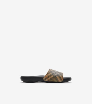 Lightweight slides printed with the Burberry Check. The contoured insole is moulded with our B shield, a motif inspired by the Equestrian Knight Design. Part of Burberry Classics, wardrobe foundations with a unique Burberry slant. Squared toe Contoured insole Burberry lettering at sole Comes with a dust bag