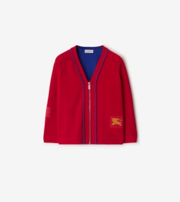 A colour-block cardigan in cashmere detailed with contrast blanket stitching. The V-neck style features knitted Equestrian Knight Design motifs, and an archival duck graphic and slogan label. Part of our childrenswear Remake capsule, a selection of products where the main material is made from surplus Burberry fabrics. Zip closure Rib-knit trims Duck label at back