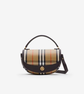Rooted in the outdoors, a crossbody bag made in Italy from a cotton linen blend trimmed with smooth calf leather and lined in cotton. The fabric is jacquard-woven with the Burberry Check and has a coated finish inspired by rainwear. A detachable leather strap switches the design from a crossbody to top handle bag. Leather top handle Adjustable leather strap Magnetic push-button closure Interior slip pocket Hand-painted edges Brushed metal hardware Engraved Burberry lettering at closure Cotton lining Comes with a dust bag