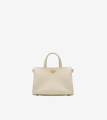 A timeless tote made in Italy from grainy calf leather, lined in a cotton blend woven with the Burberry Check in our signature sand colourway. The compact style is detailed with a check-engraved closure and D-ring hardware inspired by the belt from our iconic trench coats. Carry in hand or as a shoulder bag using the strap. Leather top handles Detachable, adjustable strap Twist-lock closure Side adjusters Interior zip pocket Hand-painted edges Brushed metal hardware Embossed Burberry lettering at front Burberry Check lining Comes with a dust bag