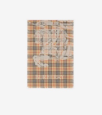 A lightweight scarf made in Italy from wool. The style is jacquard-woven with the Burberry Check, our Equestrian Knight Design and logo. Rectangular Eyelash fringing at the edges