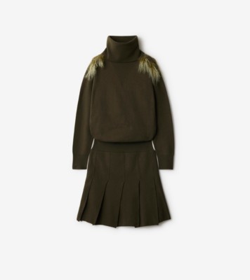 A long-sleeved dress made in Italy from wool, cut to a relaxed fit with a loose roll neck and a shearling trim at the shoulders. The lightweight style has a pleated skirt and is finished with a horse-shaped pin inspired by our Equestrian Knight Design.